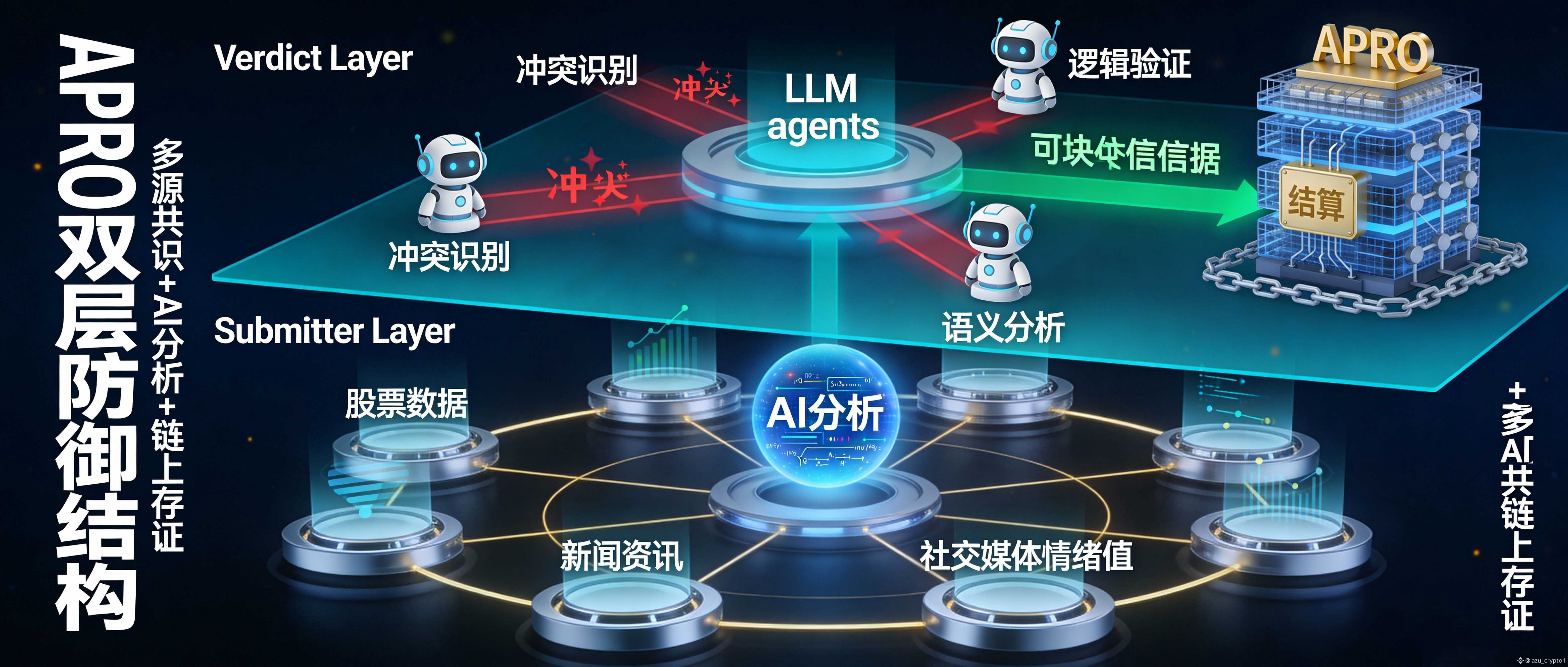 这就是为什么我反复说,多源共识和 AI 语义分析不是锦上添花,而是“防带节奏”的底层武器。你只要依赖单一来源,哪怕它看起来权威,也会存在时间差、口径差、甚至临时修订的风险;你只要只看“表面一致”,就会在极端时刻被假一致骗过。APRO 在 Binance Research 的介绍里把它的核心结构讲得很直白:Submitter Layer 的智能 oracle 节点会通过 多源共识 + AI 分析去验证数据,而 Verdict Layer 则用 LLM 驱动的 agents去处理提交之间的冲突,最后由链上结算合约聚合并交付给应用。 你把这套设计放到预测市场里看,就很像“先把信息分散地收上来,再用更强的语义脑子把冲突掰开揉碎”,把被带节奏的空间压到最小。