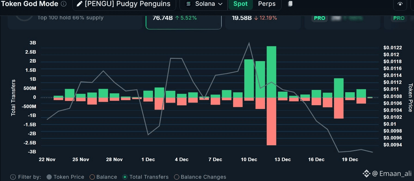 On top of that, Nansen data showed top holders controlled roughly 66% of PENGU’s supply.