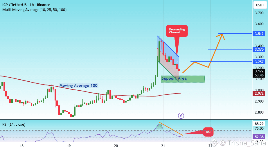 There is a key support zone in green at 3.10. The price has bounced from this zone multiple times and is expected to bounce again.