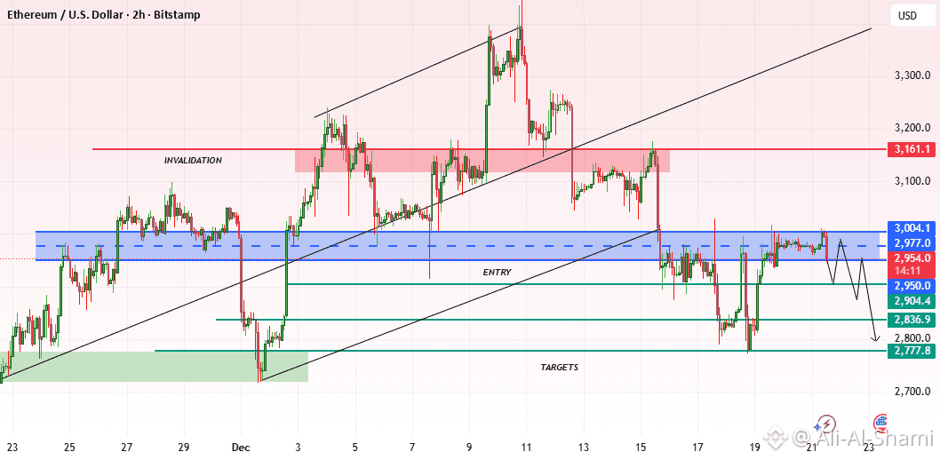 إيثريوم تعيد اختبار منطقة المقاومة الرئيسية حول 2,950–3,004، والتي كانت تعمل كمنطقة قرار متكررة طوال الحركة السعرية الأخيرة. لقد كافح السوق للحفاظ على القوة فوق هذه المنطقة، والسعر مرة أخرى يظهر ترددًا بالقرب من الحد العلوي لهذه النطاق.