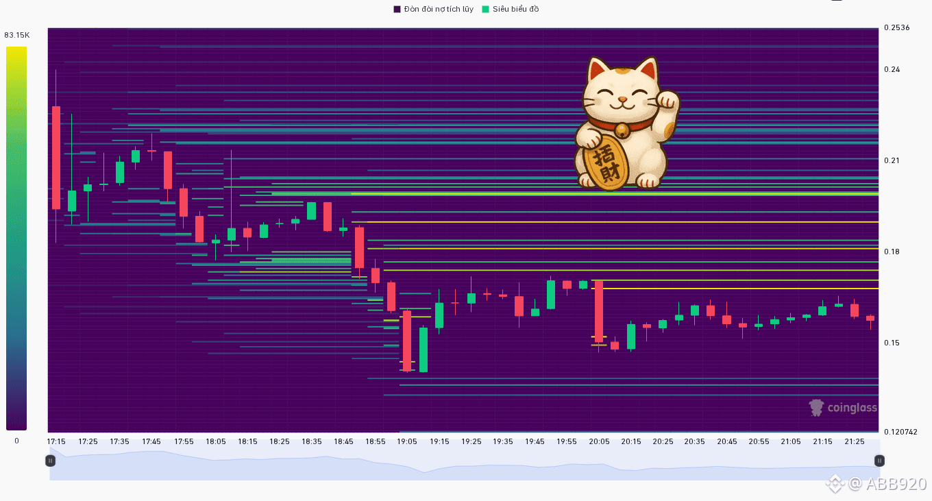 Nhìn sang biểu đồ chi tiết hơn thì rõ ngay, một cây nến đỏ chót từ vùng $0.24 rớt thẳng về $0.15. Kháng cự ở vùng $0.18 rõ ràng luôn, cứ nhăm nhe lên là bị đập xuống. Giờ thì đang loanh quanh $0.15-$0.16, volume cũng có nhưng chủ yếu là giằng co, chưa thấy dấu hiệu rõ rệt để bứt phá.