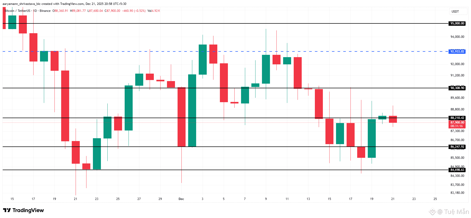 Triển vọng tăng ngắn hạn lên mức $90.308 vẫn còn, nhưng vùng kháng cự gần đó có thể sẽ kìm hãm đà tăng. Trong bối cảnh nhóm nhà đầu tư dài hạn tiếp tục bán ra, Bitcoin nhiều khả năng sẽ dao động tích lũy quanh khu vực $88.201, khi thị trường hấp thụ lượng cung dư thừa.