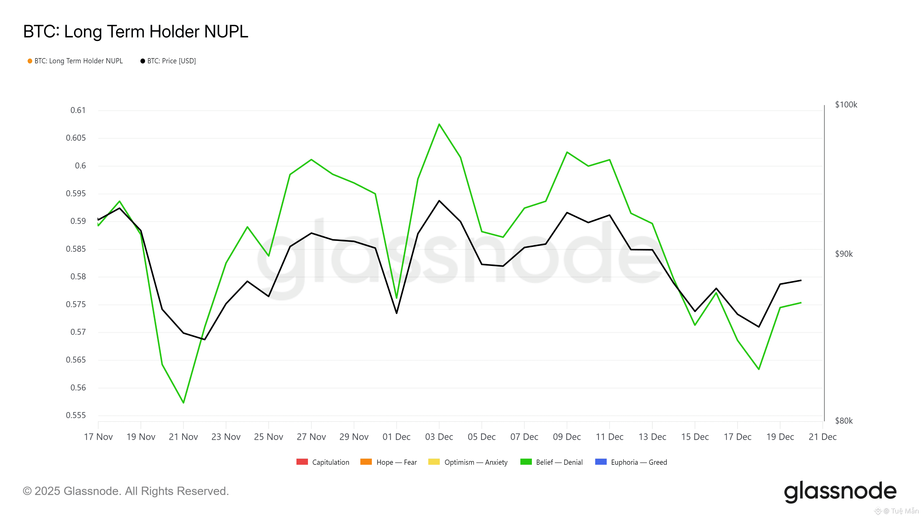 Các chỉ báo vĩ mô cũng củng cố bức tranh này. Chỉ số lợi nhuận/thua lỗ chưa thực hiện ròng của holder dài hạn (LTH NUPL) đã giảm xuống mức thấp nhất trong tháng, cho thấy lợi nhuận của nhóm này đang bị bào mòn và sự nhạy cảm với các đợt giảm giá tiếp theo ngày càng tăng.