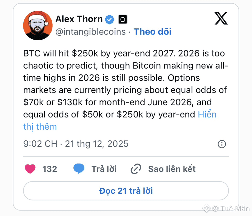 Theo Thorn, thị trường phái sinh đang phản ánh rõ nét mức độ bất định này. Định giá quyền chọn bitcoin cho thấy các nhà giao dịch đang gán xác suất gần như tương đương cho những kịch bản giá hoàn toàn trái ngược trong năm 2026.