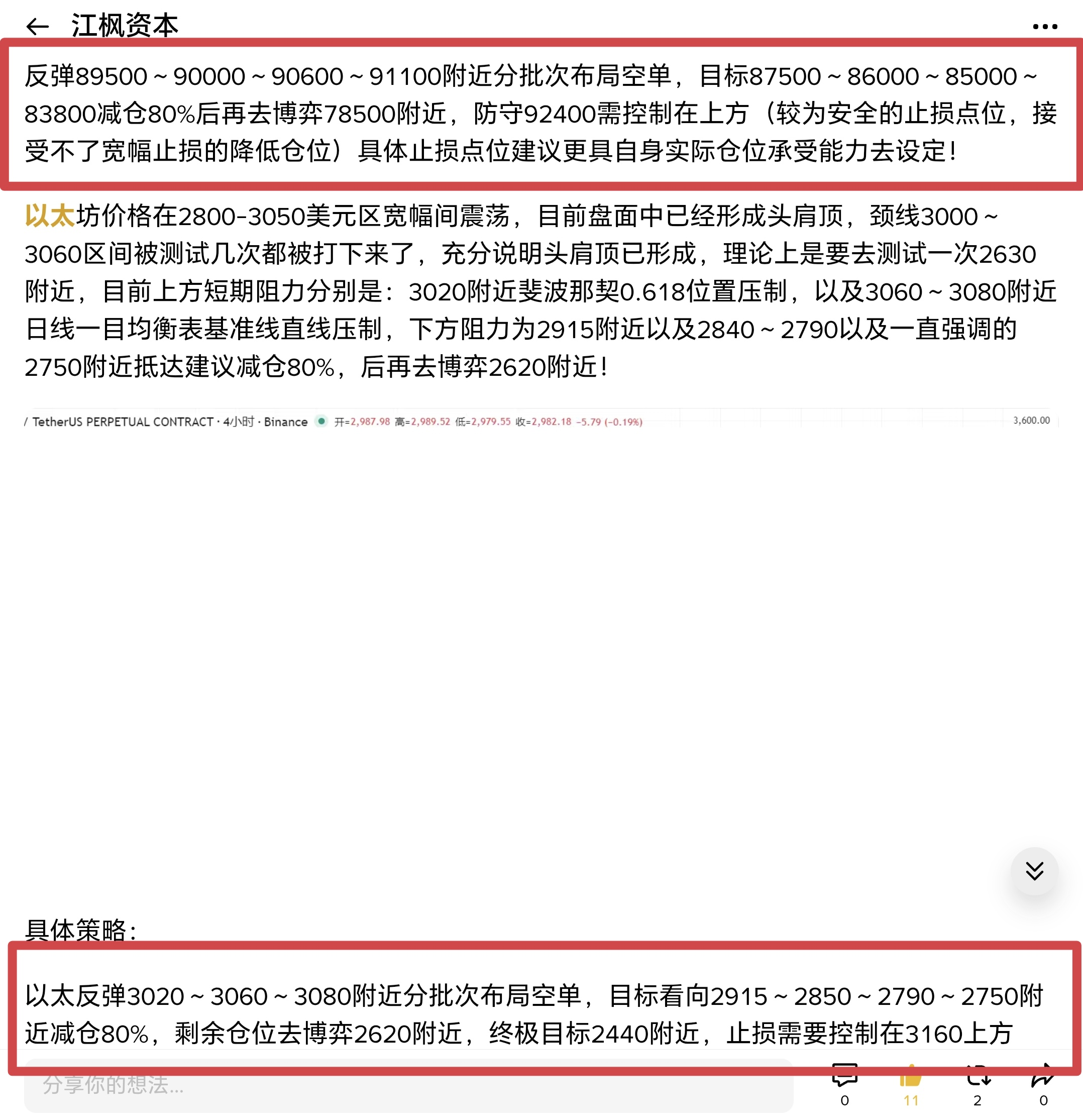 周六文章中提到$BTC 89500~90000~90600~91100附近区参与高开,今早最高来到89600一线开始走回测,刚也来到87850附近,$ETH 让大家3020~3060~3080附近空,早间刚好来到3060开始走回测,均价在3040附近,最低触及2966开始走反弹,目前3010一线,今日思路继续高空为主,具体策略我们市场中寻找答案!