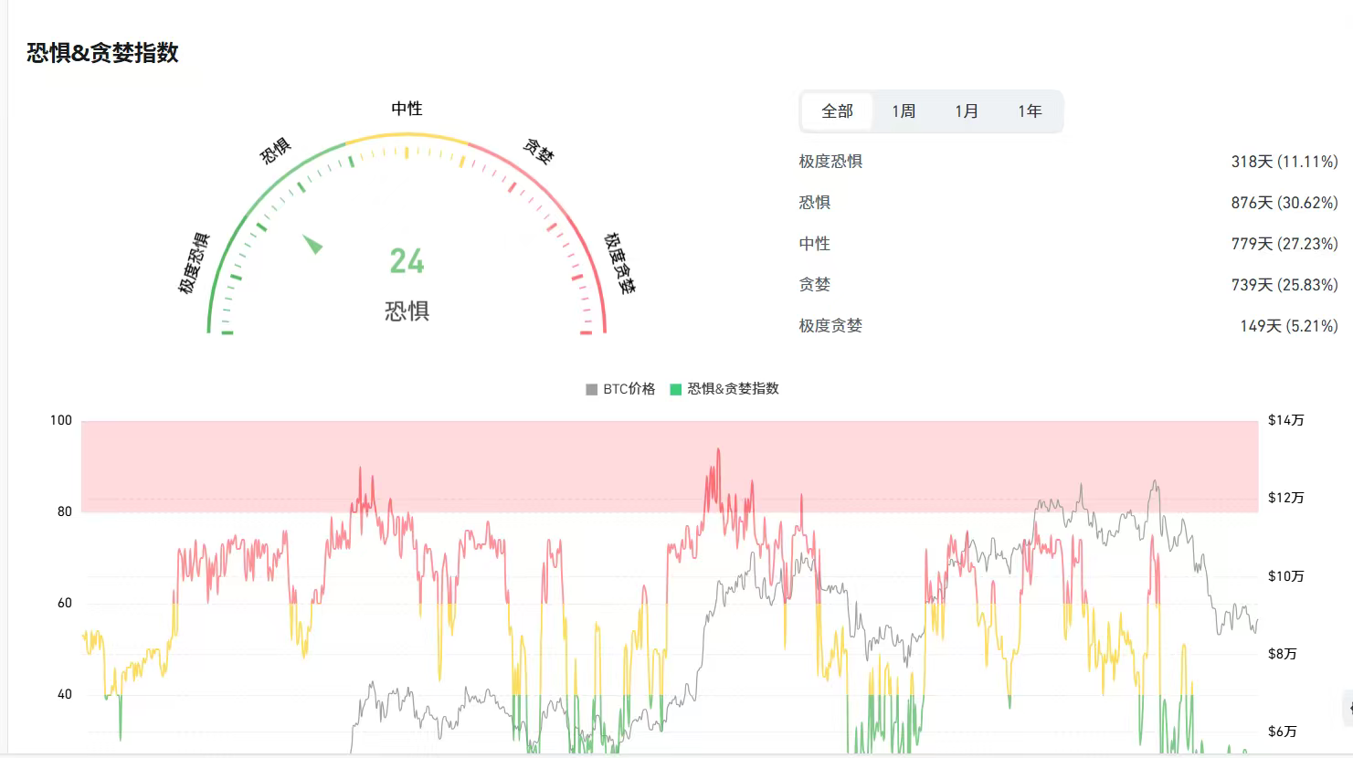 市场情绪目前处于极度紧张状态,加密货币恐惧与贪婪指数为 24 ,处于“恐惧”区域。