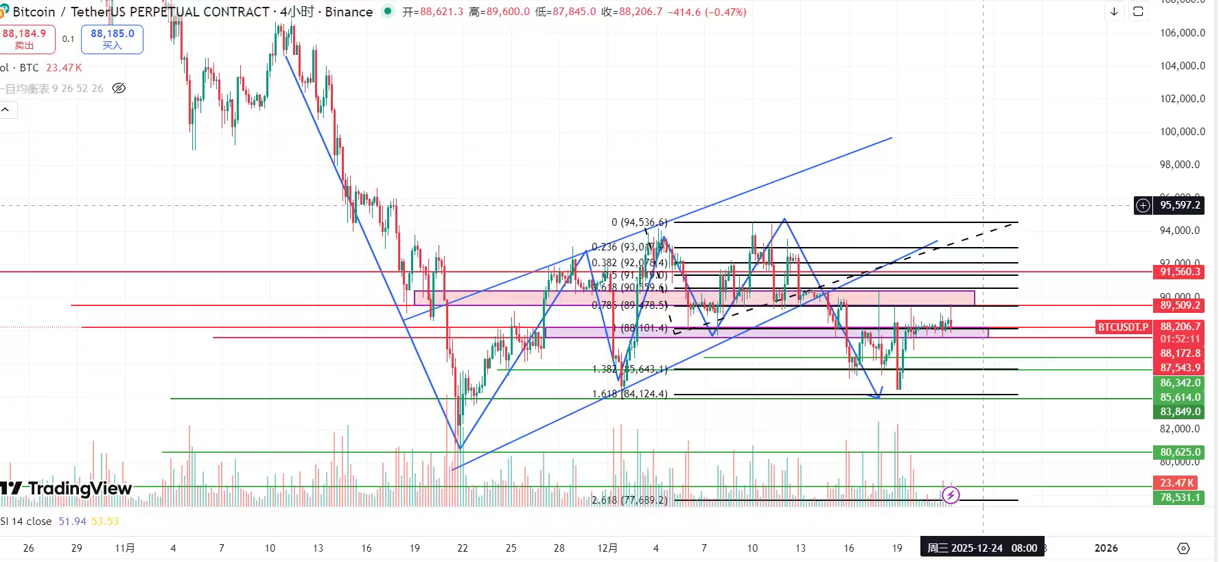 具体策略:比特币反弹89500~90600~91500附近去参与高空,止损放在91800上方,目标关注下方前期支撑区间87500~86500~83800~80600~78500附近