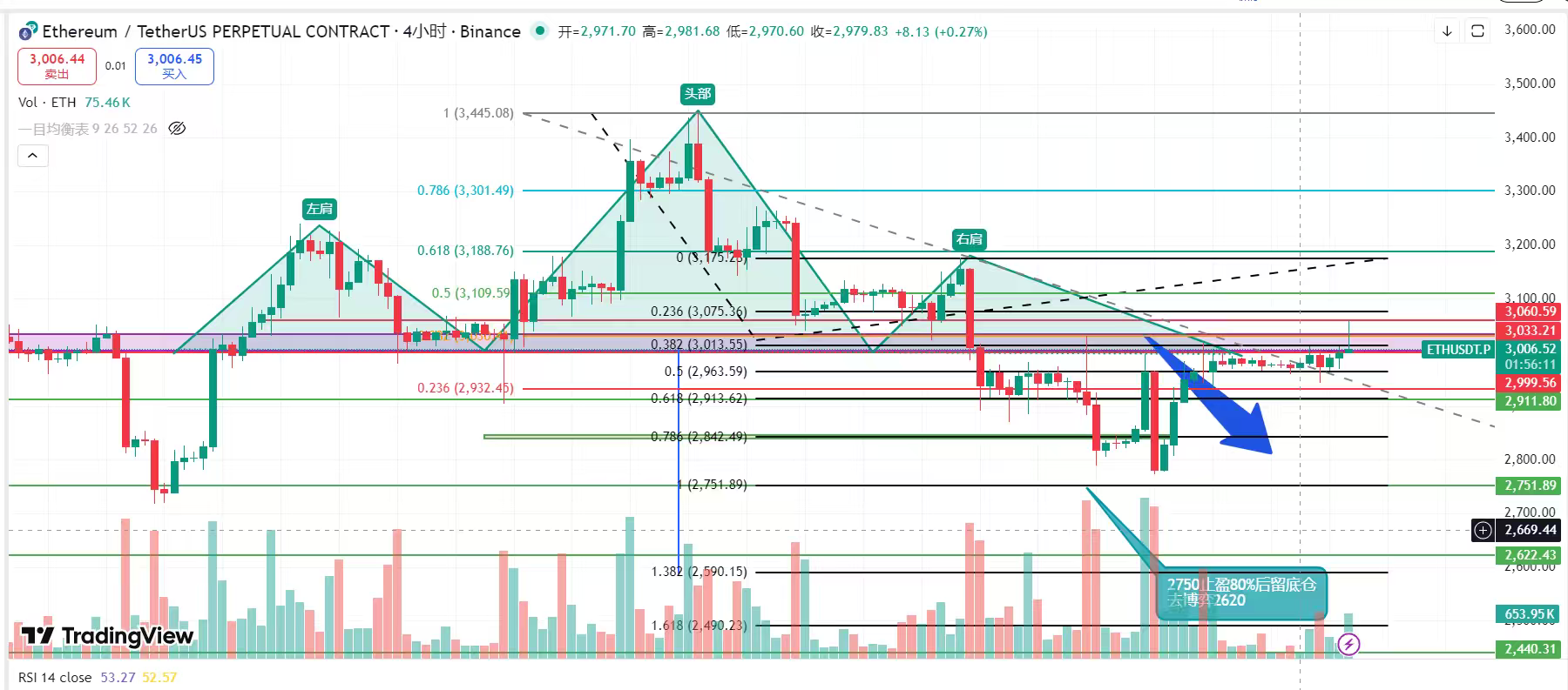 2. 以太坊早间反弹至图表中的头肩顶颈线位置3060后开始受压下行,目前上方压制依旧明显重点关注3060以及3080基准线压制和3110附近斐波那契0.5压制,和3190附近0.618压制,下方支撑现在需要重点关注2960附近,这个位置目前存在大量买盘支撑,这里能有效破位继续看2915以及2840和2750附近终极目标看完成头肩顶形态2630附近!
