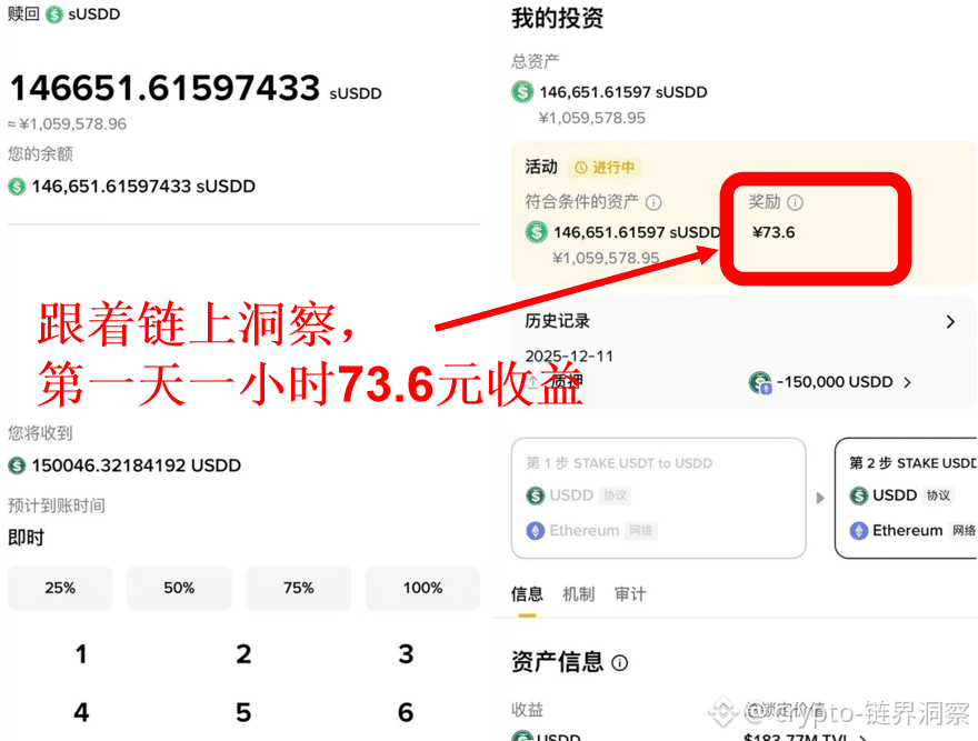 收益这块也相当给力@USDD - Decentralized USD 。就拿 15 万 U 存入 24 小时来说,能拿到 56U 的收益。这 56U 由两部分组成,一部分是基础年化 12%带来的 46U,这部分收益是固定保底且没有任何限制的,就像给你吃了一颗定心丸;另一部分是活动年化带来的 10U,不过活动年化是浮动的,活动结束 4 周后会发放。目前官网显示,sUSDD 在 Ethereum 上的 TVL 已经达到了 1.76 亿美元 #USDD以稳见信