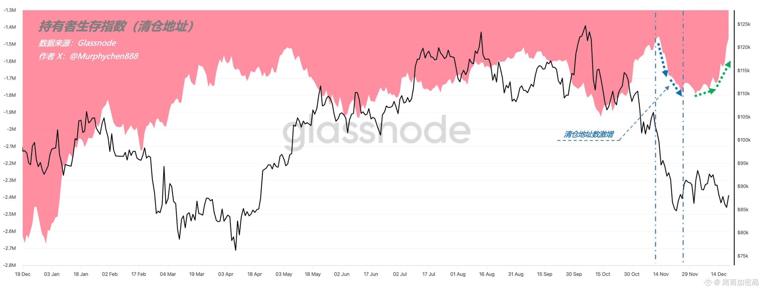 分析师 Murphy 从链上行为发现:11月中下旬曾出现地址“批量清仓”,与价格暴跌同步;而12月以来的反复探底中,清仓地址数反而下降,与期货多头回补形成印证。