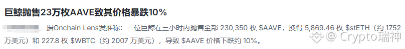 链上数据实锤:有巨鲸一次性抛售23万枚AAVE,换成stETH和WBTC跑了!这说明什么?连大资金都不看好后市,咱们散户就别硬扛了。巨鲸抛售往往不是终点,而是恐慌的开始——后续可能还有更多抛压!