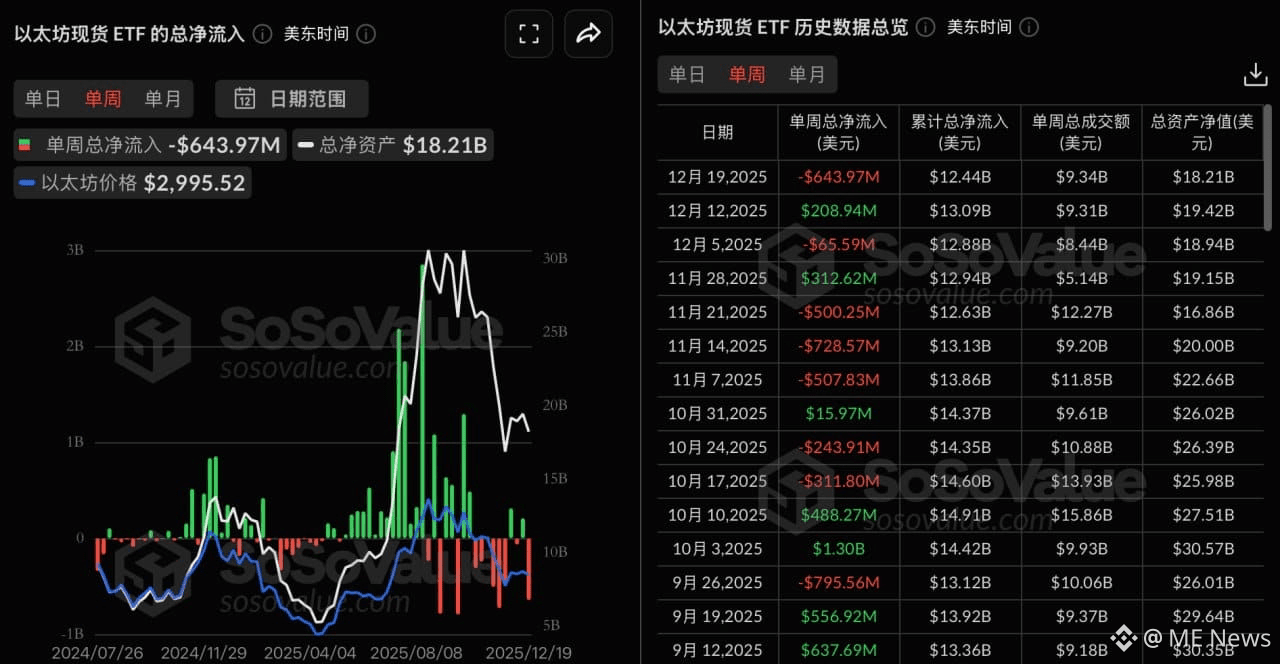 ME News 消息,12 月 22 日(UTC+8),根据 SoSoValue 数据,上周交易日(美东时间 12 月 15 日至 12 月 19 日)以太坊现货 ETF 单周净流出 6.44 亿美元,九只 ETF 无一净流入。