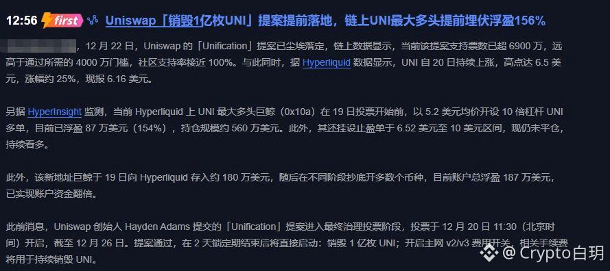 就在12月22日,Uniswap社区那场轰轰烈烈的 “销毁1亿枚UNI”​ 提案,提前拍板通过了!链上投票支持票数超过6900万,通过门槛才4000万,社区支持率接近100%,几乎是全票欢呼通过!