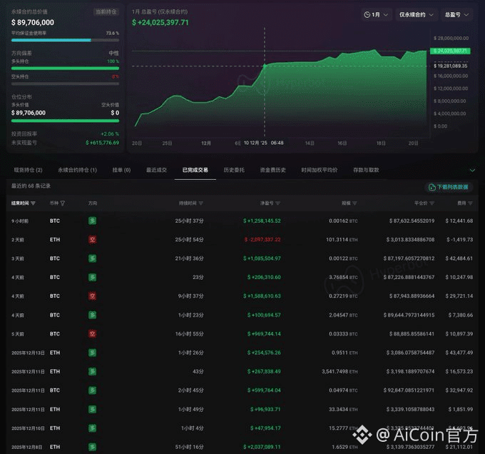 ● 其中一次典型的胜利发生在12月16日,该地址新建了一个价值约8576万美元的3倍杠杆BTC多单,并一度成为Hyperliquid平台上最大的BTC多头持仓之一。