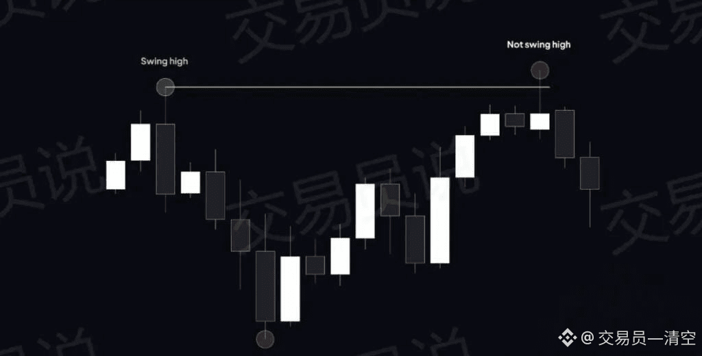 波动高点(Swing High):当某根 K 线的高点高于两侧相邻 K 线的高点时形成;