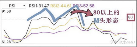 1.RSI在80以上形成M头或头肩顶形态时,视为向下反转信号,可以卖出,如下图: