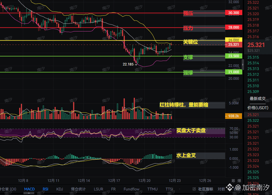 虽然整体往上走,但眼下正在一个关键区间里折腾:下面23.5是短期支撑,再往下21是这波回调的“底线”;往上呢,28是第一个压力,冲过去才能看30。有意思的是,MACD黄白线已经在0轴下面现金叉了——这是典型的“水下金叉”,往往是一波反弹的前兆!