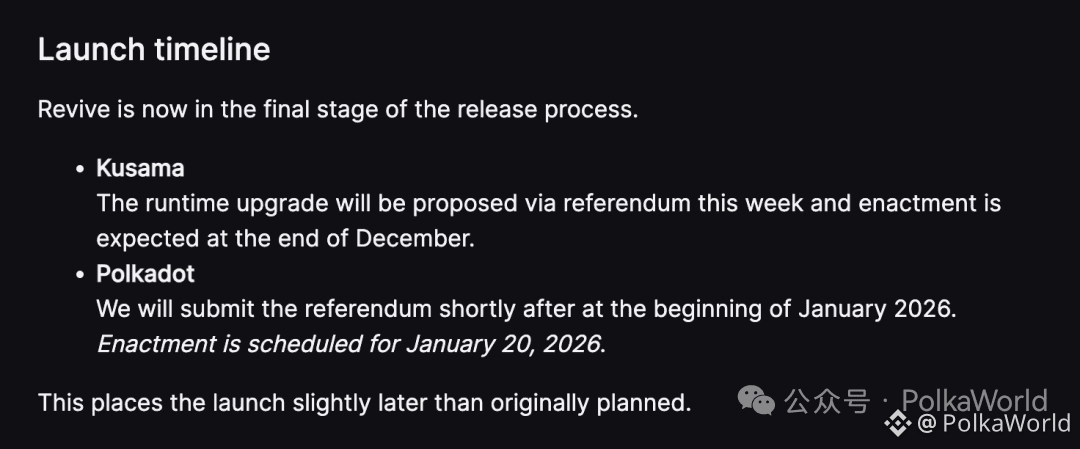 Parity 已经正式公布了 Revive 的go live时间表。不过具体流程会通过治理启动!