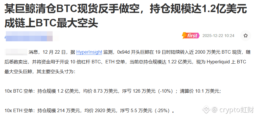 兄弟们,你绝对想不到!一条巨鲸刚刚做了件疯狂的事他清空了所有BTC现货,反手开了1.2亿美元的10倍空单!更诡异的是,他现在已经浮亏超百万美元,却依然死扛着不放。这到底是在送钱,还是在下一盘大棋?