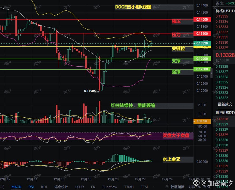 目前Doge卡在0.133附近,往上0.136是第一个坎,再往上0.140压力更大。往下呢?0.129是个短线生命线,要是跌破,可能要溜到0.126附近找支撑。那今晚到底往哪走?我倾向先看反弹,为什么?因为量能在萎缩,说明抛压暂时轻了,多头有机会偷袭一把。