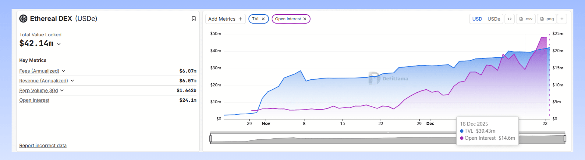 Ethereal希望透過激勵機制來促使資金留存於平台並確保它們有開倉交易,從數據來看,Ethereal未平倉合約短短四天(12/18-12/22)迅速飆升+70%。