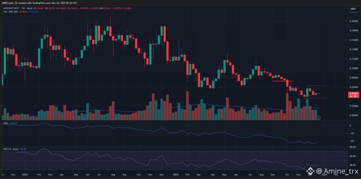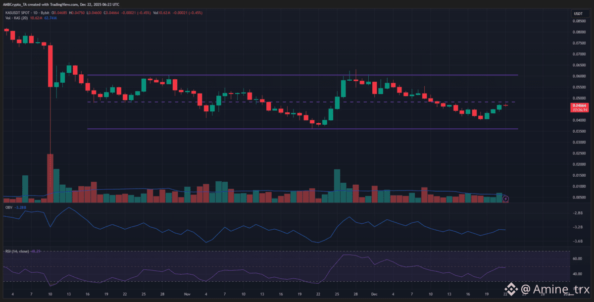 ◈ على الإطار الزمني اليومي، يتحرك سعر KAS داخل نطاق عرضي واضح منذ موجة الهبوط السابقة.