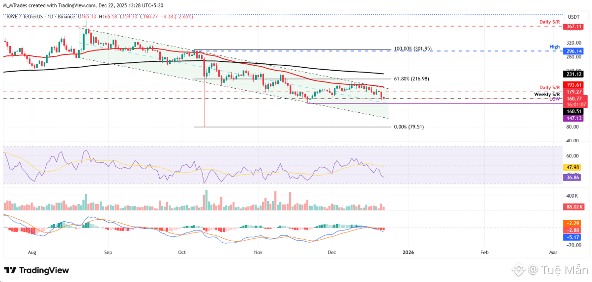 Trong kịch bản tiêu cực, nếu AAVE duy trì xu hướng giảm và đóng cửa dưới vùng hỗ trợ tuần quan trọng tại 160,51 USD trên khung thời gian ngày, đà điều chỉnh có thể còn mở rộng, kéo giá lùi về vùng đáy thiết lập ngày 21/11 quanh 147,13 USD.