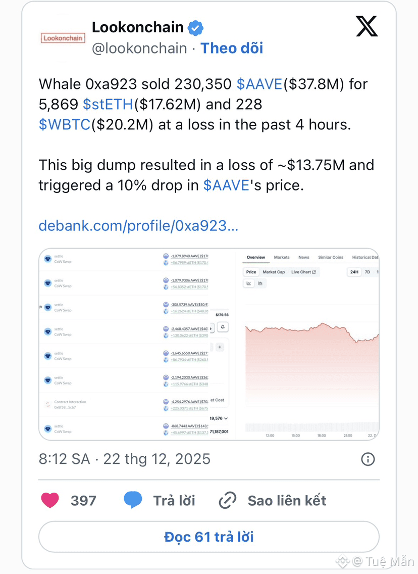 Dữ liệu từ Lookonchain công bố vào thứ Hai cho thấy một ví cá voi đã xả tới 230.350 AAVE, tương đương 37,8 triệu USD, qua đó làm gia tăng đáng kể áp lực bán lên token này.