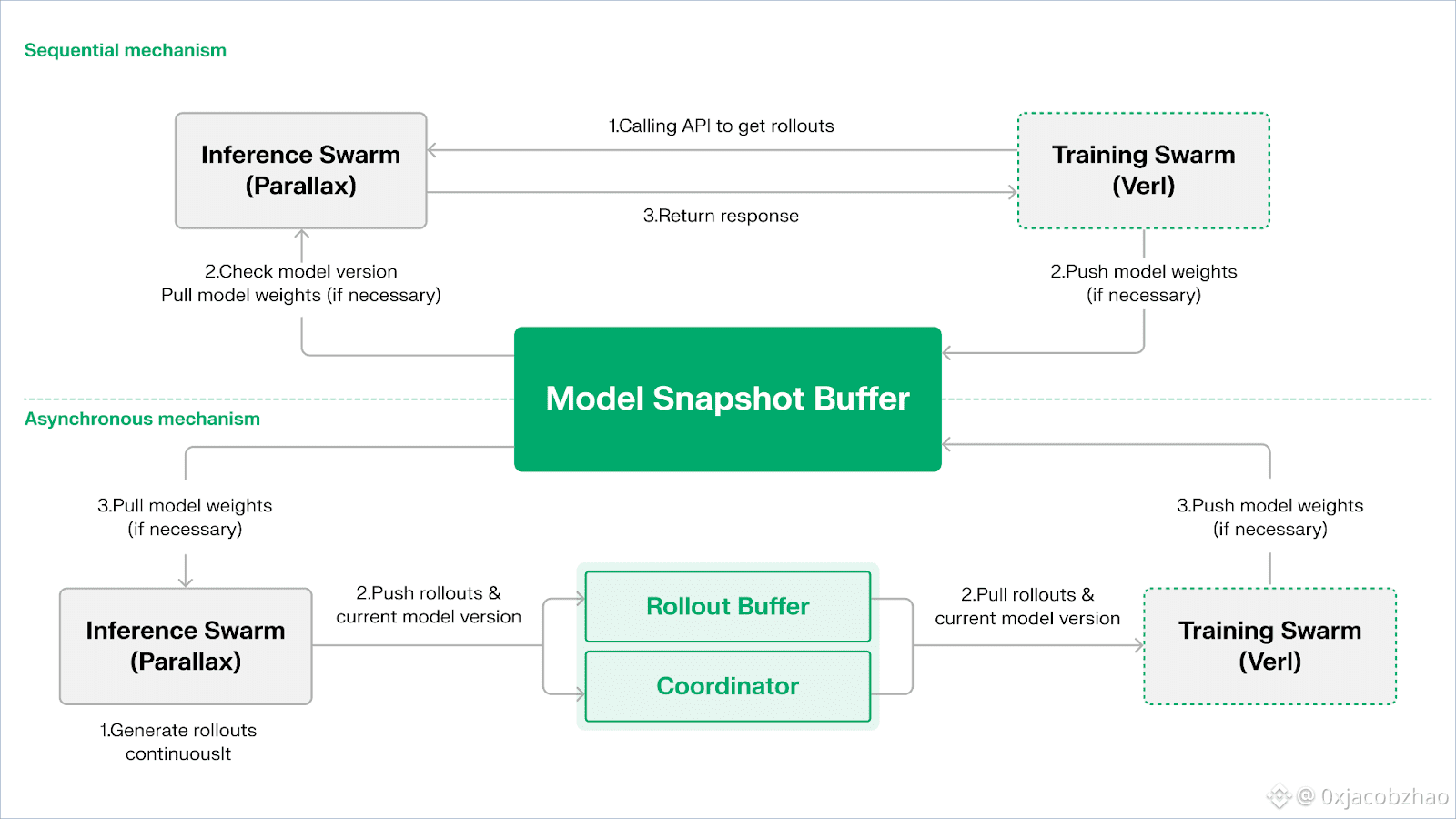 为维持策略与数据的一致性,Echo 提供 顺序(Sequential) 与异步(Asynchronous) 两类轻量级同步协议,实现策略权重与轨迹的双向一致性管理: