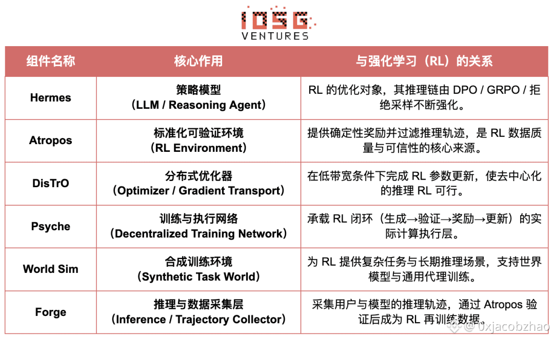 在 Nous 的体系中, Atropos 验证思维链;DisTrO 压缩训练通信;Psyche 运行 RL 循环;World Sim 提供复杂环境;Forge 采集真实推理;Hermes 将所有学习写入权重。强化学习不仅是一个训练阶段,而是 Nous 架构中 连接数据、环境、模型与基础设施的核心协议,让 Hermes成为一个 能在开源算力网络上持续自我改进的活体系统。