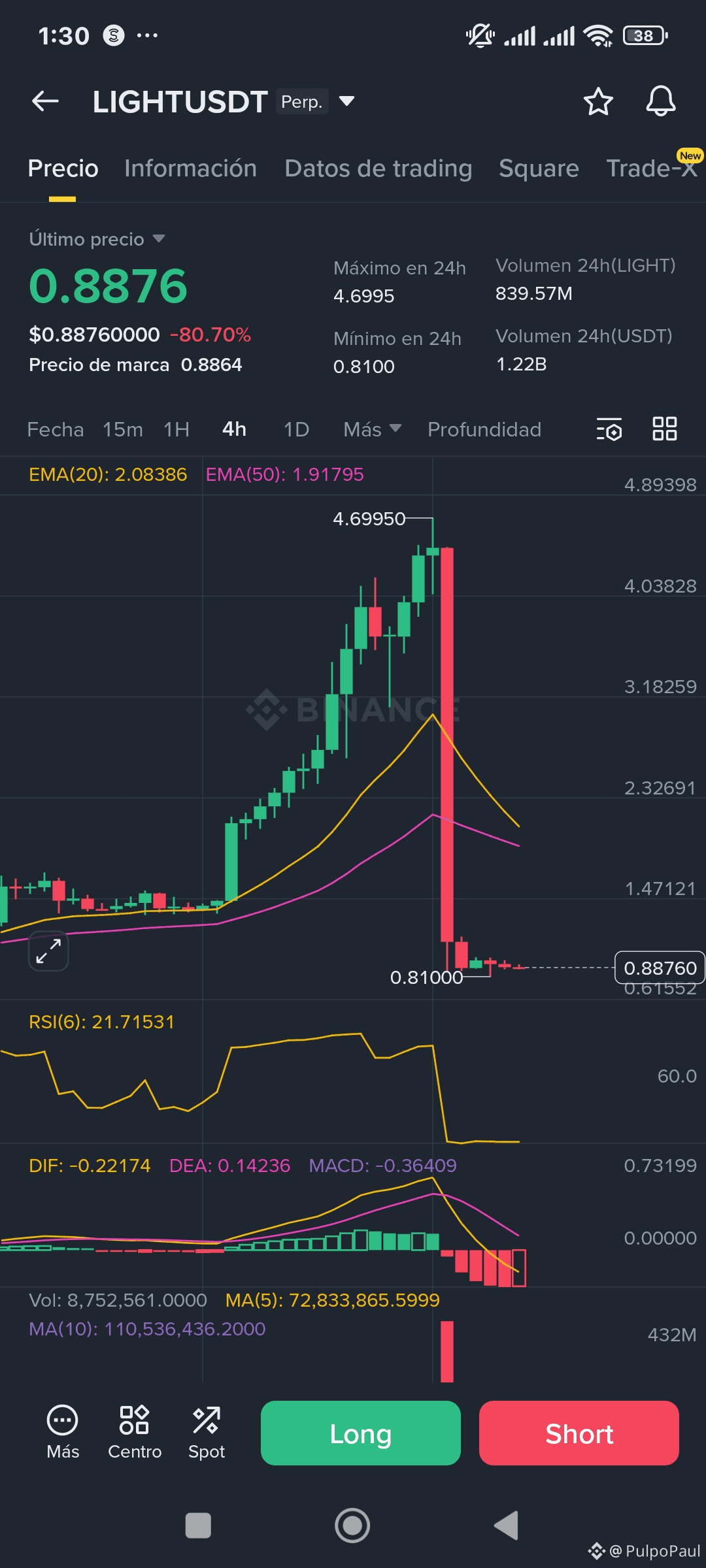 $LIGHT se desplomó −80% desde los 4.69 USDT hasta la zona actual 0.88 USDT. Movimiento típico de liquidaciones masivas + pánico.