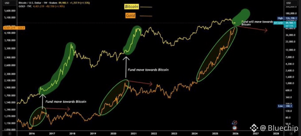 That is the main point. Bitcoin did not lead that cycle at the start. It followed after gold slowed down.