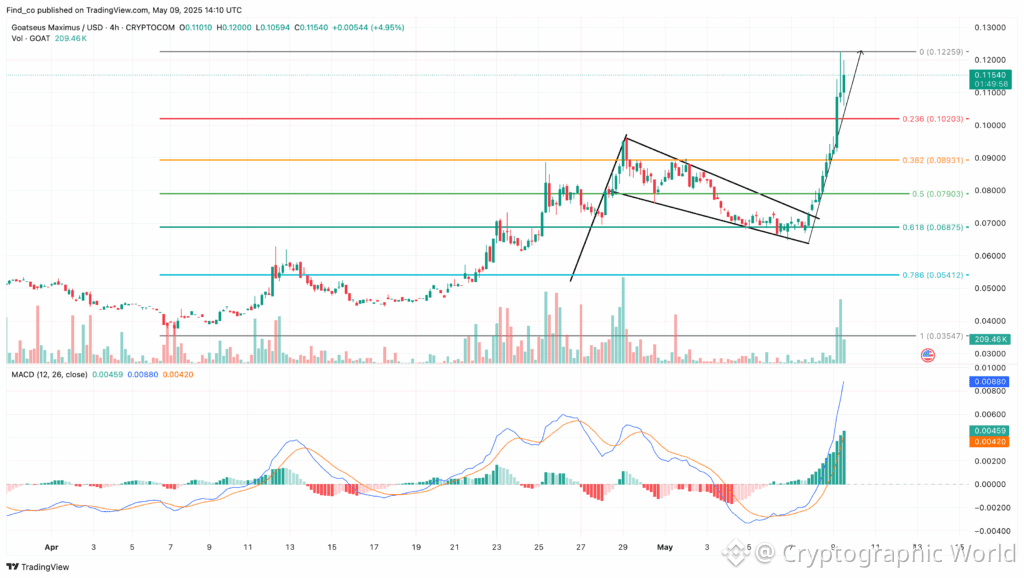 But this week, the market value climbed nearly 50% while trading at $0.12. The 4-hour chart shows that GOAT experienced this rally after breaking out of a falling wedge.