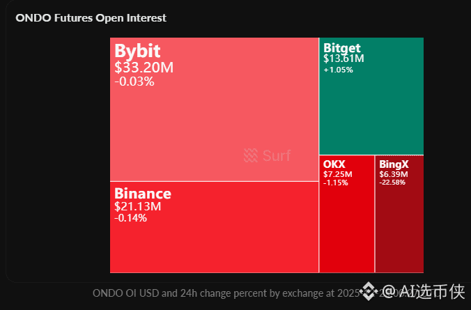 交易数据分析: 永续合约已在Binance、Bybit、OKX等主流交易所上线,合约总持仓量$106M,24小时变化+1.23%(4小时)至-2.21%(24小时),持仓量小幅波动显示多空博弈。资金费率出现极端负值信号:Binance -0.0025%,OKX高达-0.013%(8小时周期),意味着空方需要向多方支付高额费用,这种结构在短期内大幅降低做多持仓成本并可能触发空头平仓。24小时清算数据未显示大规模清算事件,说明当前价位杠杆率整体健康。社交媒体sentiment看涨,KOL强调ONDO在RWA赛道的领先地位和监管友好优势,讨论热度适中但质量较高。