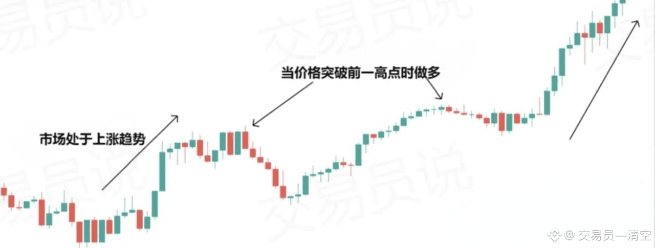 看多突破(多头突破):先确认市场存在明显的多头动能(即上涨趋势),再在价格突破前一个高点时进场做多。
