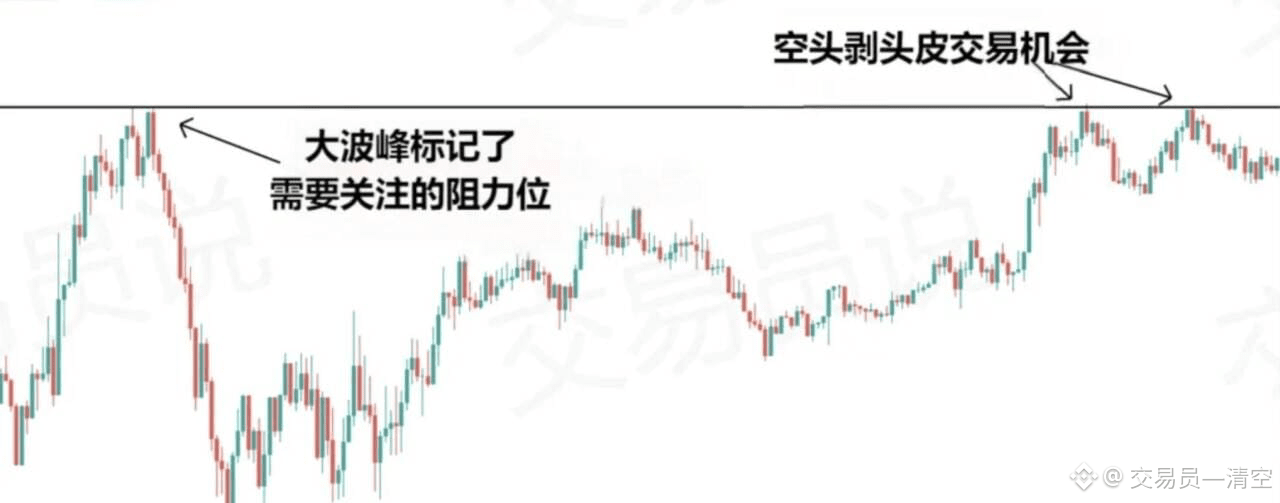 图左侧有一个明显的大波峰:价格初期稳步上升,在峰值处遭遇卖方强力介入,行情大幅反转。我们将该峰值标记为重要阻力位后,只需等待价格再次回升测试该阻力位即可。