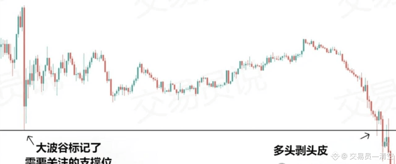 首先标记一个大波谷——该位置曾是显著的上升反转点:价格此前快速下跌(从K线来看,大概率是新闻事件引发的急跌),随后买方介入推动价格上升,形成可标记为支撑位的波谷。