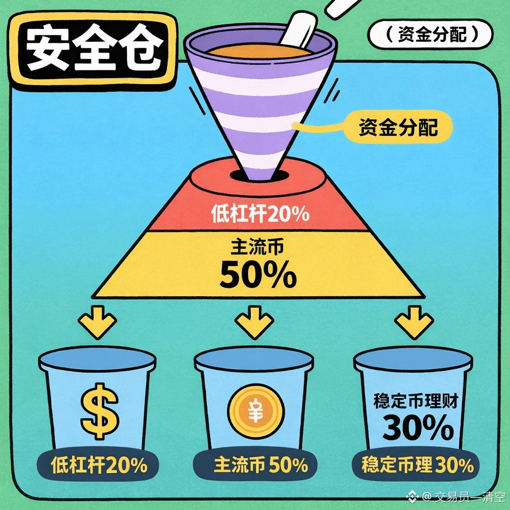 固定仓位比例:532法则,50%主流币(BTC/ETH)打底,30%布局潜力币稳定币理财,20%留现金备用合约补仓;