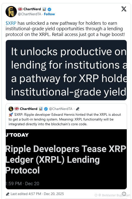$XRP ChartNerd (@ChartNerdTA), a well-known crypto analyst, has published a new post highlighting a shift in how XRP holders can interact with the XRP Ledger. He described the development as a new pathway that allows holders to earn yield through a lending protocol built directly on the XRPL.