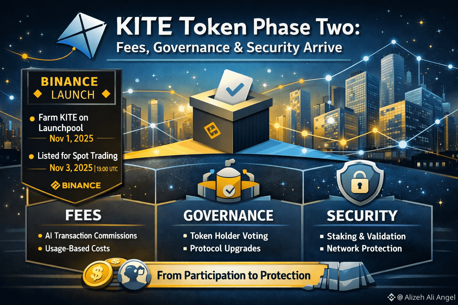 @KITE AI There’s a moment in every token story when the talk shifts from “who’s building” to “who’s paying,” from early optimism to the plain rules that keep a network alive. For Kite’s KITE token, that moment is Phase Two, where fees, governance, and network security are meant to stop being roadmap language and become daily routine. It’s trending now because Kite’s visibility jumped with a major exchange spotlight: Binance let users farm KITE through Launchpool starting November 1, 2025, and listed KITE for spot trading on November 3, 2025 at 13:00 (UTC).