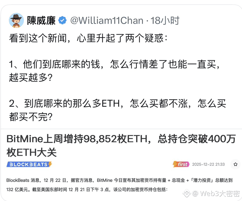 - 为什么不涨:ETH无固定上限(虽有燃烧机制,但可增发),加上市场深度大,BitMine的买入(占供应3.37%)虽巨量,但分散执行不会立即推高价格。此外,如果他们在低迷期买入,整体市场情绪弱,也抑制了价格反弹。