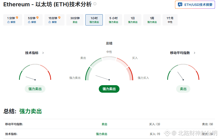别管长期故事多好听,短期K线最真实。1小时图显示,ETH被牢牢摁在下跌趋势里,所有你能看到的指标,从1小时到1周,清一色“强力卖出”。它现在被夹在几个关键位置之间:
