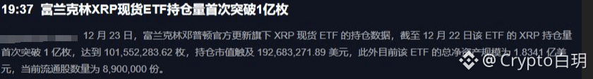 刚出的猛料,传统金融巨鳄富兰克林邓普顿更新了数据,他们家那个XRP现货ETF,持仓量历史上第一次突破1亿枚大关!价值接近2亿美元。总资产规模也到了1.83亿美金。