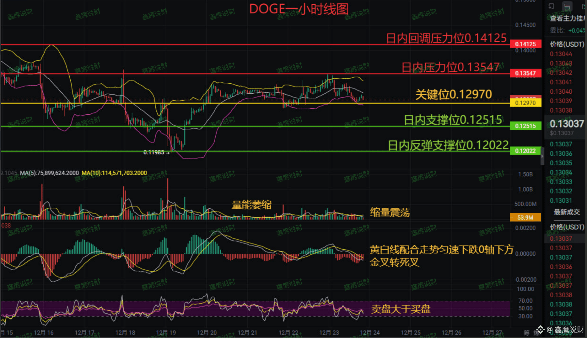 兄弟们,狗王DOGE也扛不住了!1小时图MACD死叉向下,黄白线在0轴下方匀速下跌,量能持续萎缩——这是典型的下坡路走势!上方0.13547压力如山,下方0.1297一破就是加速滑梯。圣诞周流动性枯竭,狗王是绝地反弹还是继续装死?鑫鹰用数据和盘面告诉你答案!