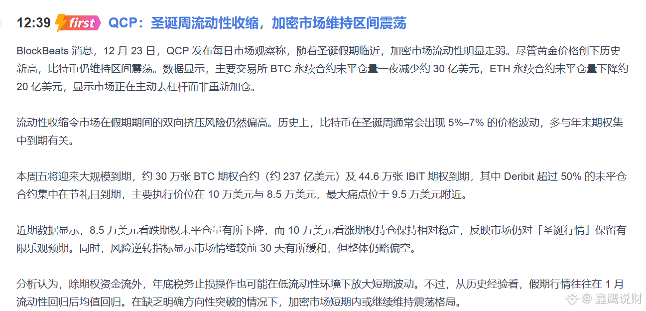 市场背景:QCP今早明确提示,圣诞周流动性已明显收缩,BTC、ETH永续合约未平仓量一夜减少约50亿美元,市场在主动降杠杆,不是加仓