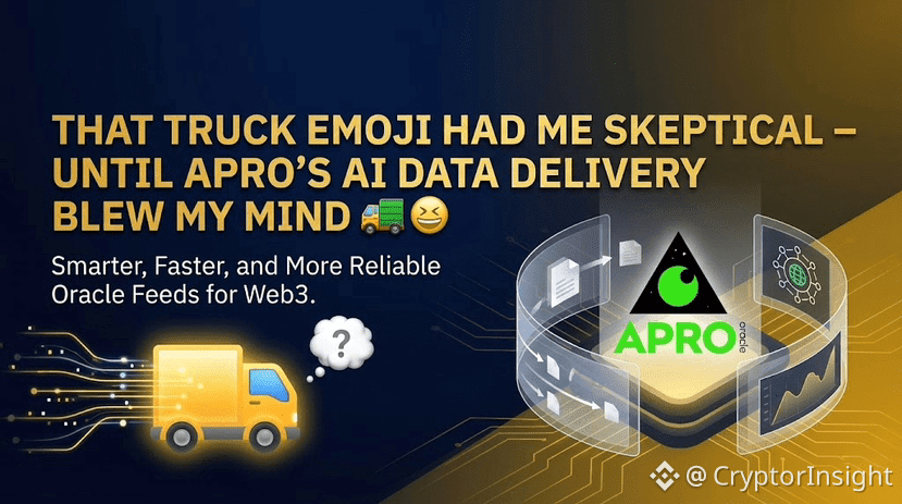 Okay, confession time: When I first saw @APRO Oracle bio with that big ol’ truck emoji 🚛, I chuckled and thought, “Cute branding for another oracle project. Probably just hauling the same old data like everyone else.” I’ve been burned before – hyped infrastructure plays that end up slower than a bear market recovery. But then I actually dug in. Read the docs, checked the price feeds on apro.com, scrolled recent updates… and yeah, I’m eating crow now. This isn’t your grandpa’s oracle. APRO is legitimately trucking ahead with AI smarts that make data feeds faster, cleaner, and way more reliable. And honestly, it’s kinda hilarious how perfectly it fits the meme.