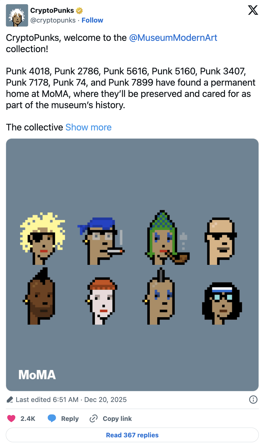 链上数字艺术迎来历史性时刻:纽约现代艺术博物馆(MoMA)正式将八件 CryptoPunks 作品和八件 Chromie Squiggles 作品纳入其永久收藏,这标志着早期区块链原生艺术获得了重要的机构认可。