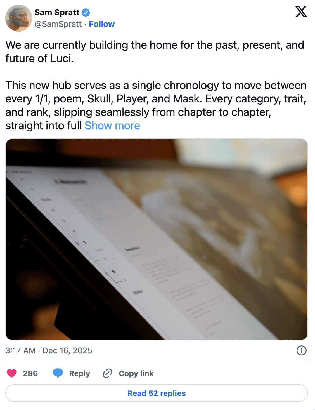 据 X 网站上 12 月 15 日发布的一篇文章称,纽约数字艺术家 Sam Spratt 表示,他正在建立一个新的在线中心,以容纳他的 Luci 项目的全部过去、现在和未来。
