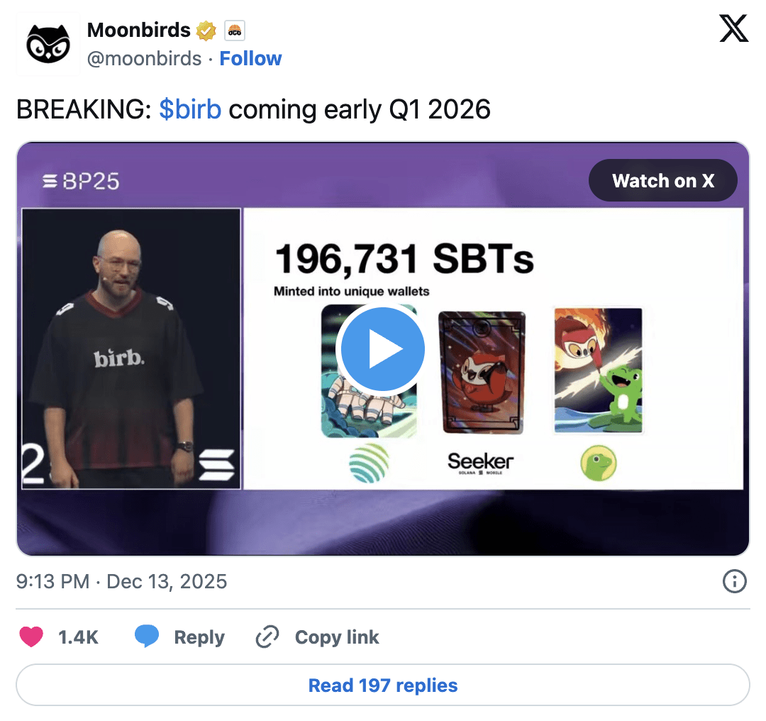 Moonbirds 宣布计划于 2026 年初推出 birb 代币