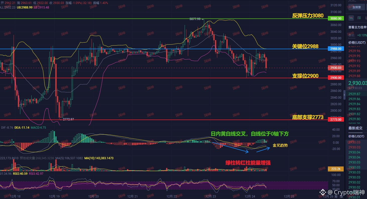 瑞神认为ETH连2988都摸不到!反弹在2960-2980区间,然后必定掉头。一旦跌破2900心理关口,下一目标就是2773。逻辑很简单:期权到期利空压顶+技术面弱势+资金分歧,三座大山之下,任何反弹都是逃命机会!